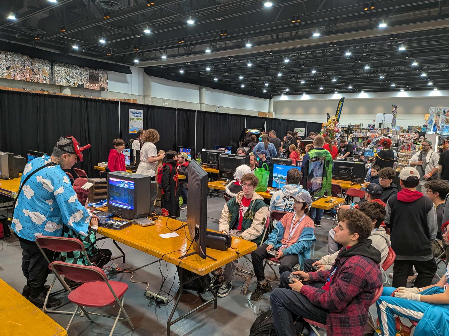 Les fans de jeux vidéo n’étaient pas laissé en plan, puisque les amis et partenaires de La Planque Jeux Vidéo occupaient une vaste section du parterre de la salle marchande où les gens pouvaient jouer à toute une variété de jeux, autant rétro que néo! Annexé dans cette section se trouvait un petit comptoir où les employés de La Planque courraient dans tous les sens afin de répondre à la myriade de gens à la recherche de jeux et/ou d’objets geek! J’ai pu saluer rapidement la charmante Stéphanie Thériault, co-propriétaire du commerce, qui avait “de la broue dans l’toupet” comme on le dit en Québécois!