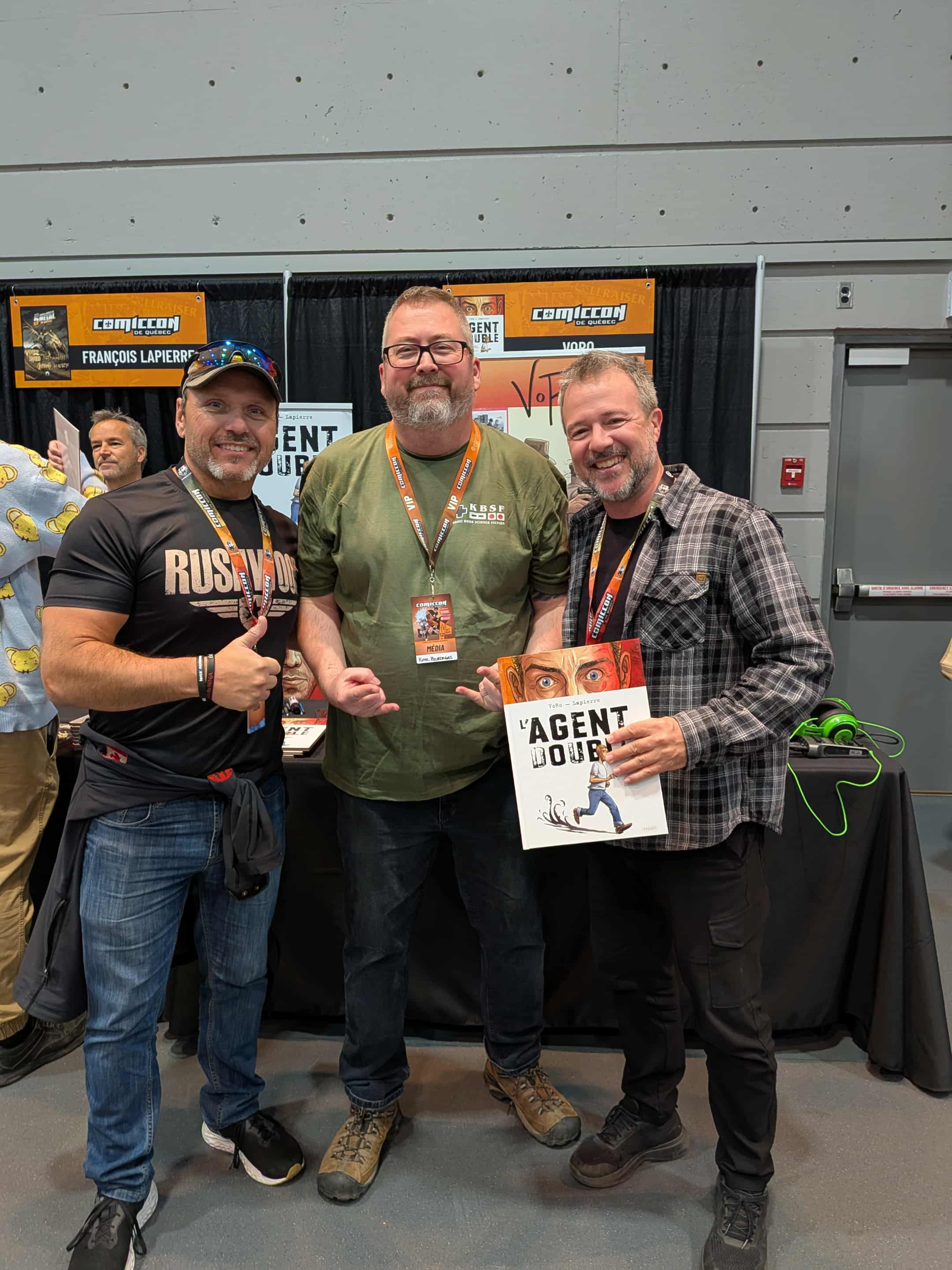Les amants de BDs pouvaient également profiter de la présence de plusieurs auteurs afin de leur serrer la pince, échanger un brin avec eux et profiter de l’occasion pour faire dédicacer leurs BDs ! J’en ai profité pour enfin rencontrer en personne le célèbre Vincent “VoRo” Rioux, qui était sur place pour présenter ses BDs, dont sa plus récente en tant qu’artiste solo, l’Agent Double. Vincent était d’ailleurs accompagné par le confrère François Lapierre, avec qui il a travaillé sur plusieurs illustrations de la BD “L’histoire de 5 grands groupes Metal du Québec – Tome 2“, BD qui a été officiellement lancée le vendredi précédent le Comiccon.