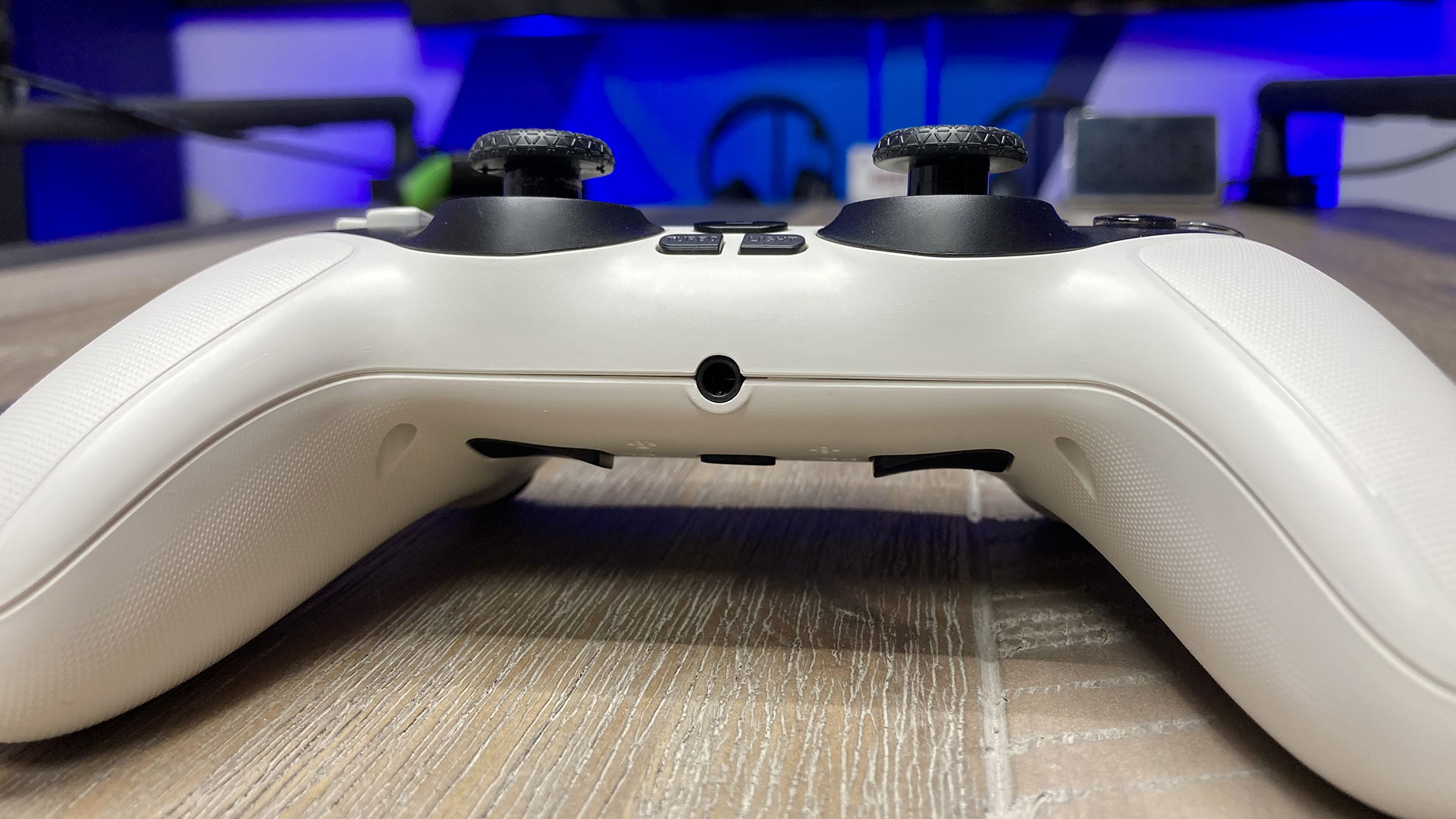 La Gamrombo est plutôt modeste du côté de ses connectivités. Donc sur celle-ci, vous trouverez une prise casque 3,5 mm, qui permet d’y brancher un casque filaire pour le son. Et sur le dessus de la manette, vous trouverez un port USB-C afin de pouvoir la charger ou l’appairer à votre PS5 ou votre PC. Même si la manette utilise le Bluetooth pour se connecter sans fil, il ne faut pas oublier qu’elle n’est pas compatible avec les écouteurs Apple et elle n’inclut pas de micro intégré, seulement un haut-parleur.